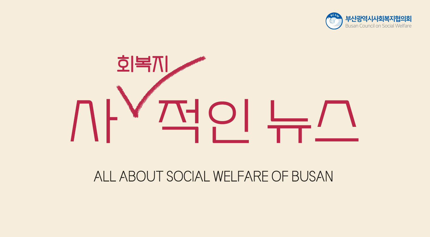 부산 사회복지 현장의 소식들을 가져왔어요! 2023. 7월호 / vol. 90 | 웹에서 보기 | 지난호 보기 JULY. 2023 안녕하세요 부산광역시사회복지협의회 '사-적인 뉴스'입니다. 2023년 상반기가 훌쩍 지나고, 본격적인 하반기가 시작되었습니다. 올해 상반기는 왜 이렇게 더 빠르게 지나갔는지 모르겠어요. 아마도 사회복지종합센터 입주 덕분...? 그래서 준비했습니다. 저희 협의회 직원들이 종합센터를 궁금해하시는 분들을 위해 (안 궁금해도 보세요!) 종합센터 식구를 소개하는 영상을 제작했어요. 정말 아무 준비없이 방문해서 노!필!터!로 찍은 영상임을 참고해주세요. (촬영에 협조해주신 협회 실무자분들 감사드려요♥) 아래 영상 함께 보시며 바쁜 와중에 휴식을 즐기는 7월이 되길 바라요! 그럼 7월의 부산 사회복지계 소식을 가득 담은 '사-적인 뉴스' 시작할게요! (관심 있는 사진과 글은 클릭해주세요) "결국 다 피가 되고 살이 되는 컨텐츠" 함께 살펴볼 통계, 현안, 시책 [기획재정부] 2023년 하반기부터 이렇게 달라집니다. [한국보건사회연구원] 지표로 보는 KIHASA 사회보장 동향 - 소득과 주거 [한국보건사회연구원] 나를 위협하는 기후위기, 우리에게 필요한 자세 [한국보건사회연구원] 사회보장 재정추계 주요 과제 [서울시복지재단] 윤석열 정부의 사회보장 전략 함께 보고싶은 기사와 콘텐츠 [국제신문] 코로나發 빈곤도미노…부울경 기초수급 9만 가구 폭증 [국제신문] 한창 일할 청·장년에 더 가혹했다…40대 빈곤층 3년새 3685명 늘어 [국제신문] 중구 수급가구 1071곳↑ 원도심·서부산 ‘허리’부터 무너져 [국제신문] 부산 4월 출생아 1000명 간신히 턱걸이…또 역대 최저 [국제신문] 태어난 기록 없는 ‘유령아동’ 부울경 244명 [국제신문] 부산시 다자녀 기준 자녀 3명서 2명으로 확대 [국제신문] 탈부산 속 출산율 추락…청소년인구 12년새 24만 명 급감 [국제신문] 1억 이상 보조금 받는 민간단체, 보고서 외부 검증 의무화 [국제신문] 부산 40·50대 취업자 1만8000명 감소…실업률은 3.5%로↑ [부산일보] ‘돌봄 소외’ 중장년, 이르면 8월부터 일상 돌봄 받는다 [부산일보] 팬데믹 시기 부산 청년 4명 중 1명 직장 그만뒀다 [부산일보] 발달장애인에게 새 도로는 ‘그림의 떡’ [부산일보] 코로나19 돌봄부담에… 취학아동 있는 집 맞벌이 비율 줄었다 [한겨레] ‘저임금-장시간 노동’ 판 깔아주는 정부…“이대로는 임금 격차 확대” [한겨레] ‘실질 최저임금’은 2년째 하락 중…고물가에 장시간 노동·투잡 작성 '사-적인뉴스' - 부산사회복지적인뉴스, 2023. 8월호 | Vol. 91 '사-적인뉴스' - 부산사회복지적인뉴스, 2023. 6월호 | Vol. 89 목록 글쓰기
