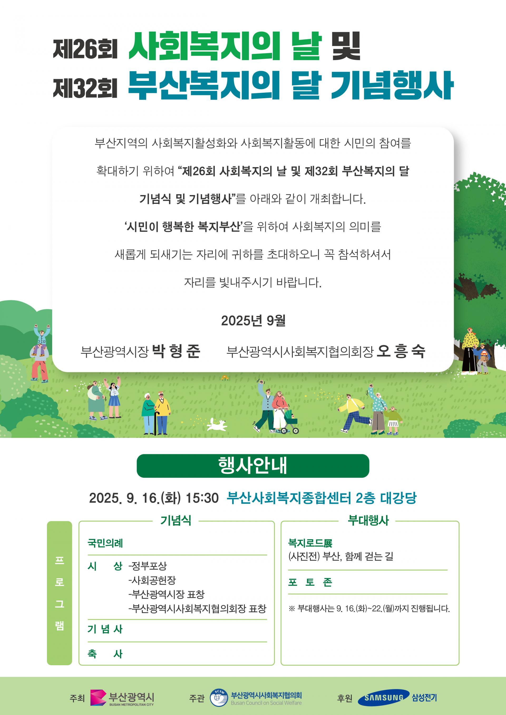 우리 협의회는 오는 9월 '사회복지의 날 및 부산복지의 달'을 맞이하여 사회복지분야 종사자 및 시민들에게 사회복지에 대한 이해증진과 제정의미 전달을 위하여 기념일의 의미 안내와 기념식을 개최합니다.
