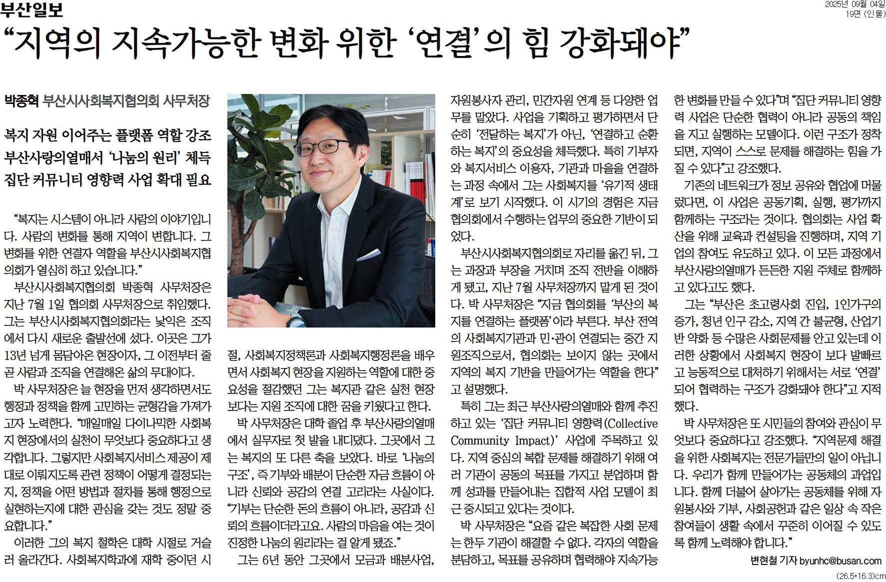 [부산일보 인터뷰] “지역의 지속가능한 변화 위한 ‘연결’의 힘 강화돼야” 박종혁 부산시사회복지협의회 사무처장